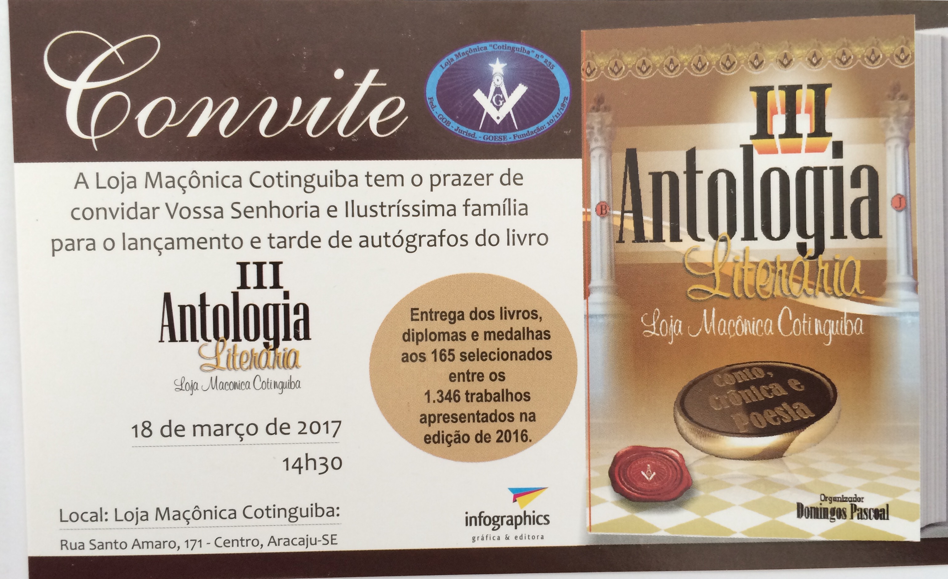 Você está convidado para o lançamento e tarde de autógrafo coletivo da III ANTOLOGIA LITERÁRIA DA LOJA MAÇÔNICA COTINGUIBA. A solenidade acontecerá a partir das 14.30h do dia 18 de março de 2017 no centenário Templo da Loja Maçônica  Cotinguiba. A sua presença é de sua ilustríssima família em muito honrará este que o maior concurso literário feito no Brasil com alunos/estudantes do fundamenta e médio de todas as escolas: publicas e particulares.
